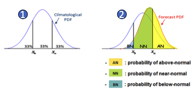 Probabilities are estimated by comparing the forecast probability density function (PDF) with the corresponding model climate PDF, estimated from the hindcast set (1993-2016). The probabilities are stratified according to the lower/upper/middle third of the model climate distribution.