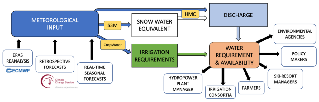 The first objective of SPHERE is to employ the most advanced dynamical seasonal forecasting systems, hydrological models, downscaling and analysis tools to develop a semi-operational forecast chain (Fig. 1) that delivers high-resolution spatially distributed seasonal forecasts of hydrological indicators, i.e. snow water equivalent, meltwater runoff and streamflow, to estimate the amount of water that will be available for the ecosystems and socio-economic activities in the season ahead, providing early information if